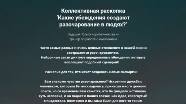 Часто самые разные и очень ценные отношения в нашей жизни завершаются разочарованием. Нейронные связи диктуют определенные убеждения, которые воплощают подобный сценарий! ⠀ Раскопка для тех, кто хочет создавать новые сценарии! ⠀ Вам знакомо чувство разочарования? Искренняя дружба с человеком, которым Вы восхищались, принесла много ценного опыта, но со временем Вам кажется, что Вы увидели истинную суть человека, и он падает в Ваших глазах, как идол, свергнутый с пьедестала. Возможно и Вы сами были для кого-то таким идолом? ⠀ Что будем трансформировать? ⠀ ✔Завершим убеждения и схемы, что выход из отношений возможен только через разочарования и конфликт, даже если они превратились в паразитирующие и есть желание двигаться дальше. ✔Посмотрим, как низкие вибрации подобных убеждений влияют на работу гормональной системы, создают гормональный дисбаланс и эмоциональные качели, и изменим это! ✔Будем исцелять гормональную систему и работать с паразитарными программами! Обязательно будут рекомендации, какие аромамасла помогут это изменить на уровне физического тела. ✔Создадим новые эффективные сценарии — пути решения через ценность, благодарность, умение говорить «нет» и выходить из отношений! ⠀ Вы по-новому увидите, кто вокруг Вас – истинные друзья или кто-то ждет от Вас жертвы, что происходит в Вашем окружении и источниках дохода! ⠀ Это Ваша возможность создавать истинные отношения!