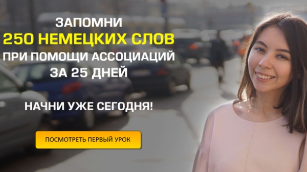 Сколько занятий в курсе, и как долго курс длится? Всего в курсе 25 уроков, новый урок каждый день — курс длится 25 дней.   Из чего состоит каждый урок? Урок состоит из 10 ассоциаций к 10 немецким словам, примеры употребления этих слов, упражнения на отработку слов и ответы для самопроверки.   Когда начинается курс, в какое время проходит? Это видеокурс, Вы можете начать проходить его сразу после оплаты. Каждый день в 5 утра по московскому времени будет открываться новый урок.   Для какого уровня подойдет курс? С помощью ассоциаций можно запоминать слова любой сложности. Слова в курсе соответствуют примерно уровню А2.   Сколько нужно времени, чтобы пройти каждый урок? Видеоуроки длятся около 10 минут + время на выполнение домашнего задания (10 минут). Всего около 20 минут в день.