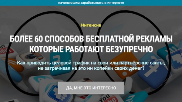 Как это, бесплатно? Бесплатно – это значит не тратя на это деньги. То есть вы не будете тратить ни одного рубля на рекламу, а получать целевых посетителей будете. Но… это не значит, что вам не придется вкладывать в бесплатные способы привлечения трафика вообще ничего. Вот тут, как раз, нужно понимать, что вы будете тратить другие ресурсы: время, силы, навыки и т.п. Что же лучше? Ну вот подумайте: зачем тратить много денег на рекламу, если ее можно сделать бесплатной? Что если я скажу Вам, что бесплатная реклама иногда работает намного лучше платной? Кроме очевидного плюса бесплатных методов рекламы (а именно то, что они, собственно, бесплатны), есть еще 1 самый главный плюс: они работают на то, что люди постепенно узнают о вас и именно поэтому приводят к Вам самых целевых клиентов. Почему? Потому что в данном случае, Вы не “впариваете” свои продукты и услуги (как делают все ваши конкуренты), а просто работаете над своей узнаваемостью среди тех людей, которые сами ищут то решение, которое Вы продвигаете. Этот интенсив будет полезен для новичков, которые не хотят тратить много денег на платную рекламу, а также, этот интенсив будет полезен уже опытным, которые начали задумываться над тем, чтобы стать более известной личностью в интернете. Начинайте именно с этого Вот скажите мне, если люди никак не реагируют на любые ваши бесплатные предложения, то как вы сможете хоть что-то им продать или предложить что-то за деньги? Они бесплатно-то ничего не берут, а уж за деньги тем более ничего покупать не станут. И вот как раз бесплатные способы рекламы помогают понять: сможете ли вы зарабатывать на том или ином товаре или нет. И как только вы видите, что какой-либо из бесплатных методов срабатывает, вы тут же можете использовать его уже для привлечения людей платными способами. Ведь тогда вы точно не потеряете деньги на рекламе. А это значит, что начинать нужно всегда именно с бесплатных методов рекламы. И только потом использовать платные. Что будет на интенсиве? Более 60 способов привлечь трафик на ваши или партнерские сайты Мы подробно разберем все эти способы и вы точно сможете их использовать для продвижения своих проектов (партнерок). Получится подробное пошаговое видеоруководство по каждому из способов. Что лично вам нужно сделать, чтобы ваша бесплатная реклама начала приносить вам деньги Огромный «затык» большинства начинающих в том, что они в корне не правильно преподносят то, что хотят предложить. И в этом блоке вы поймете свои ошибки (если они у вас есть) и быстро их исправите. Ну а если вы их не делали, то теперь сможете избежать их. Как начать получать результат максимально быстро? Что и, главное, как необходимо сделать, чтобы максимально быстро начать зарабатывать деньги с помощью бесплатных способов рекламы. И почему у многих так и не получается это сделать? Уже на интенсиве вы можете получить первые результаты За время интенсива вы сможете настроить несколько бесплатных способов получения трафика. А если в дальнейшем освоите хотя бы 20% из того, что узнаете, то в разы окупите стоимость участия в интенсиве.